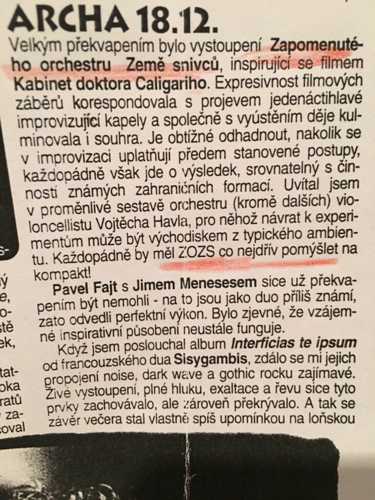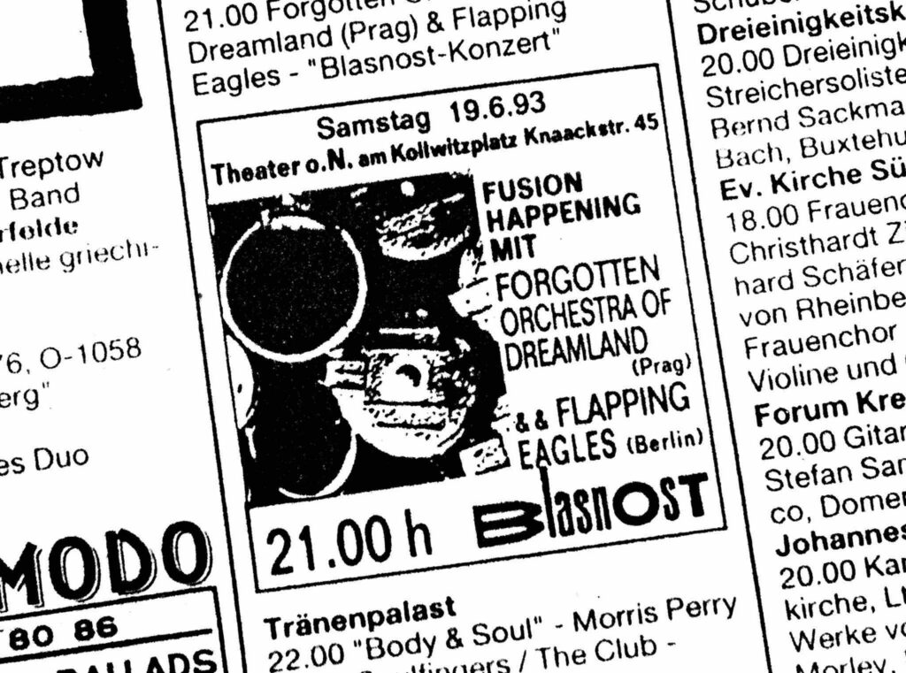 I was inventing two musical groups and thinking about their names. One of those days, both names came to me on that bench at once. I was looking at Prague and that was it. From the „Bohemian Forest’s Clincer“ – a primitive musical instrument made of old iron rods that had surfaced everywhere – there were clocks that went as fast as they wanted. The second, larger group was for now just a vision of free improvised music unfettered by any musical style and certainly not by the vision and demands of any composer. I wanted all the players to enjoy the music making equally and to invent it together… (that’s how foolish I was back then).